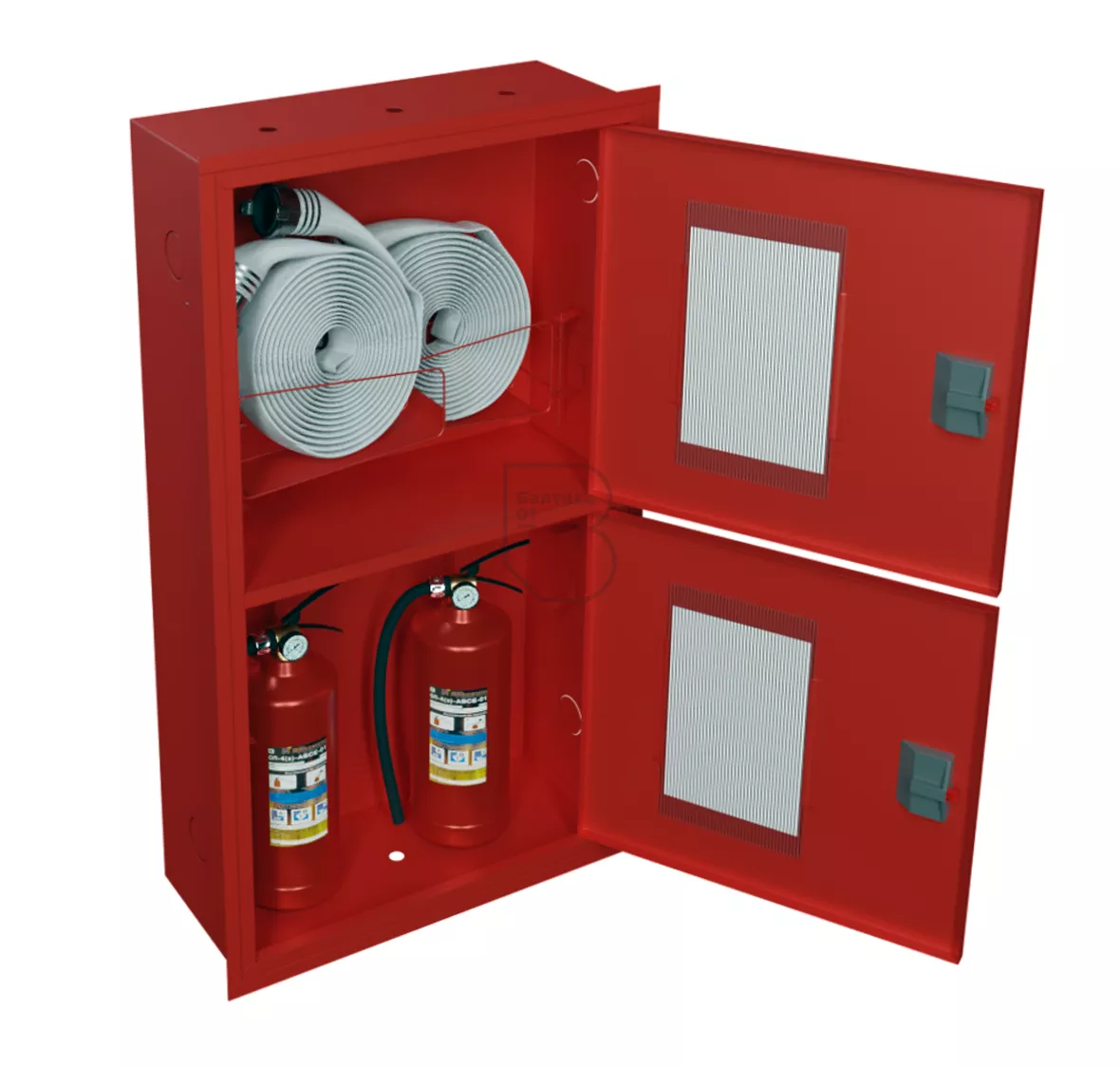 По типу монтажа – встраиваемый, по наличию смотрового окна на дверцах шкафа – открытый, по цвету изделия – красный (RAL 3000).